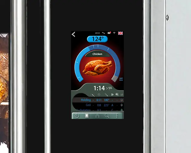 TDR and LDR smart auto-clean rotisseries feature intelligent controls with 250 programs, each allowing up to 9 cook stages. With high-speed double-loop convection, Cook Correction technology automatically adjusts for half-loads, overloads, or temperature variations, ensuring consistent food quality and safety. The Eco Cooking feature uses residual heat to save up to 5% energy in the final cooking phase. Additional smart features include a USB connection for easy data transfer, and optional Wi-Fi for remote monitoring and recipe management via the SmartConnect dashboard.